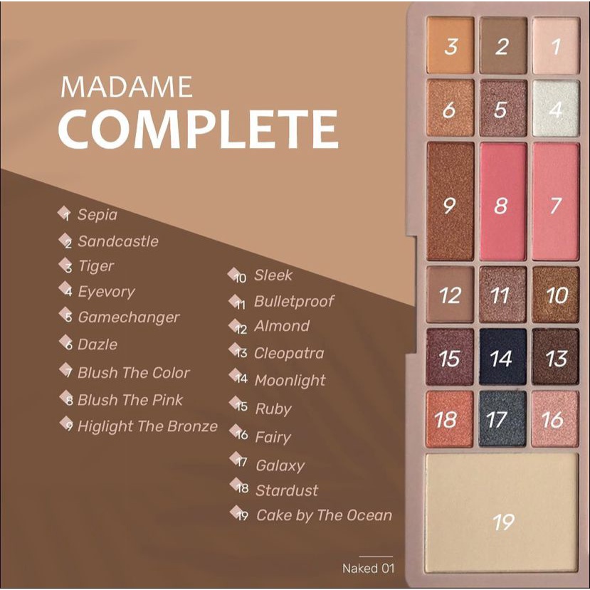 Madame Complete: Complete Yourself More with Madame Complete: Palet ini terdiri dari 4 produk berbeda: Eye Shadow, Blush, Highlighter dan Two Way Cake. Dengan formula berpigmen dan tahan lama, palet ini siap menjadi palet riasan harian Anda.