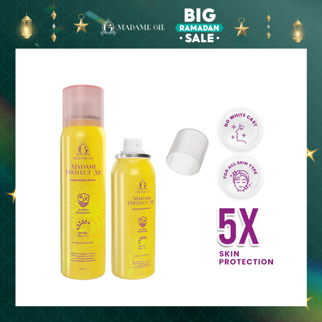 Madame Protect Me Spray Suncreen hadir untuk melindungi kulit dari sinar UVA dan UVB dengan perlindungan ekstra SPF 50+ PA++++ yang wajib digunakan setiap hari sebelum beraktivitas maupun saat sedang beraktivitas. Selain melindungi kulit dari paparan sinar UV, Sunscreen spray ini juga dapat melindungi kulit dari radiasi Blue light sekaligus menutrisi kulit karena dilengkapi dengan kandungan skincare yang dapat membantu mengurangi kerutan pada kulit wajah dan melembabkan kulit. Dilengkapi dengan 360o Protection Technology yang mampu mencakup seluruh bagian kulit wajah saat diaplikasikan, memiliki tekstur yang ringan, mudah menyerap dan tidak meninggalkan whitecast sehingga nyaman saat dipakai dan tidak mengganggu aktivitas seharian.