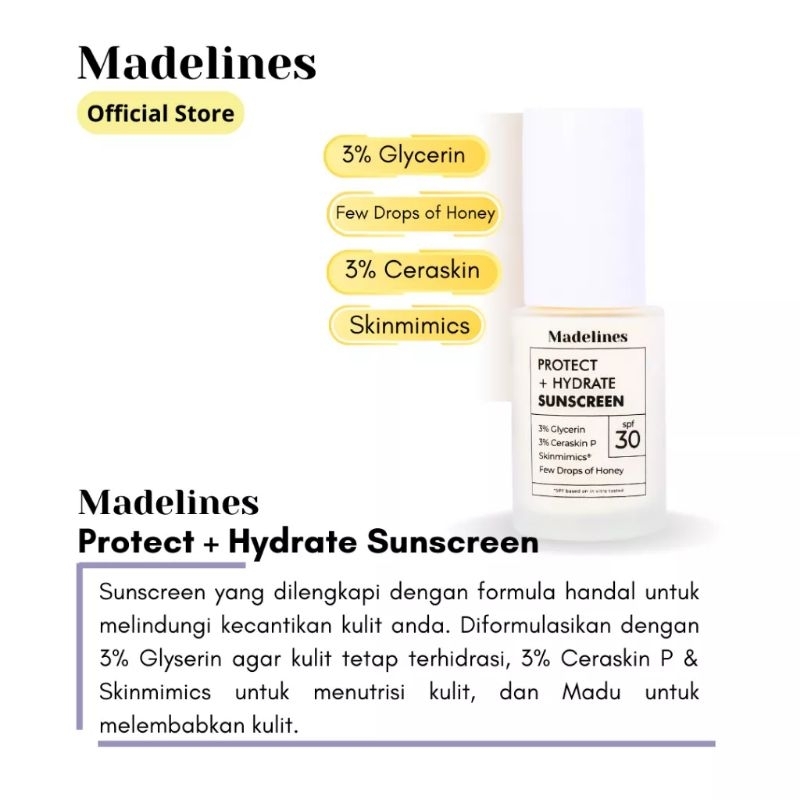 MADELINES PROTECT + HYDRATE SUNSCREEN NA18231700262 35 mL Madelines Protect + Hydrate Sunscreen SPF 30 PA++++ adalah tabir surya yang cocok untuk semua jenis kulit. Sun Protect yang dilengkapi dengan formula handal untuk melindungi kecantikan kulit anda. Diformulasikan dengan 3% Glyserin agar kulit tetap terhidrasi, 3% Ceraskin P & Skinmimics untuk menutrisi kulit, dan Madu untuk melembabkan kulit. Melindungi kulit dari efek buruk sinar matahari dengan SPF 30 PA++++ tanpa meninggalkan whitecast. Cocok digunakan untuk umur 15 tahun keatas Aturan Pakai: ▪️ Aplikasikan sebanyak 2 (dua) ruas jari. ▪️ Oleskan dan ratakan pada bagian wajah dan leher. ▪️ Reapply sunscreen setiap 3-4 jam sekali untuk kegiatan di luar ruangan. Notes: ▪️ Mohon cek kelengkapan serta kondisi produk sebelum menyelesaikan pesanan. ▪️ Komplain terkait pesanan hanya dapat diproses apabila status pesanan belum selesai, disertai dengan adanya bukti video unboxing. ▪️ Informasi mengenai expired date atau informasi produk lebih lanjut dapat menghubungi kami melalui chat.