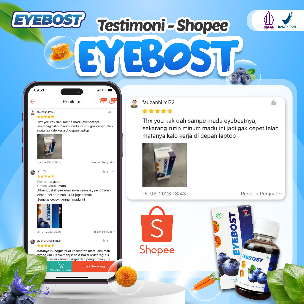 🍯 𝗞𝗼𝗺𝗽𝗼𝘀𝗶𝘀𝗶 𝗘𝘆𝗲𝗯𝗼𝘀𝘁 : - 𝙈𝙖𝙙𝙪 : menjaga kesehatan mata, meningkatkan kekebalan tubuh, menambah nafsu makan - 𝙀𝙠𝙨𝙩𝙧𝙖𝙠 𝙗𝙪𝙖𝙝 𝙗𝙞𝙡𝙡𝙗𝙚𝙧𝙧𝙮 : Memelihara kesehatan mata, memperkuat otot mata, memperlambat terjadinya rabun jauh atau rabun dekat serta membuat mata lebih cemerlang, membantu tubuh kita melawan kerusakan dan penyakit, mengurangi peradangan dalam tubuh, mengurangi kekeringan mata dan kelelahan mata, menurunkan kadar gula darah, meningkatkan kesehatan jantung - 𝙀𝙠𝙨𝙩𝙧𝙖𝙠 𝙗𝙪𝙣𝙜𝙖 𝙢𝙖𝙧𝙞𝙜𝙤𝙡𝙙 – 𝙡𝙪𝙩𝙚𝙞𝙣 : Mencegah retina dari pengoksidasi ketika menyerap cahaya, itu juga melindungi pembuluh darah kecil mata dan mempertahankan sirkulasi darah yang baik, mencegah rabun jauh, katarak, glaucoma, anti kanker - 𝙀𝙠𝙨𝙩𝙧𝙖𝙠 𝙒𝙤𝙧𝙩𝙚𝙡 : Mengandung Vitamin A yang bagus untuk memelihara kesehatan mata dan membuat penglihatan mata menjadi jernih