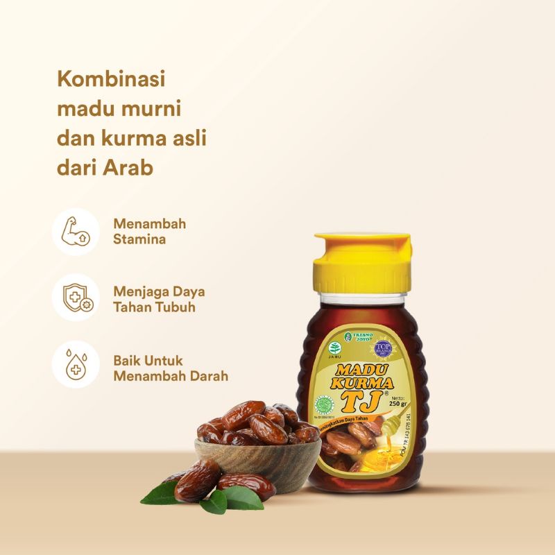Madu kurma TJ merupakan perpaduan antara madu murni dengan sari kurma asli dari Arab.