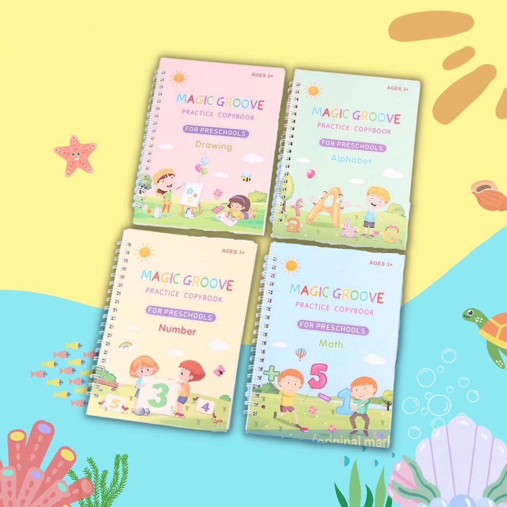 1 paket berisi: - 4 buku (Huruf, angka, menggambar, matematika) - 1 pen - 10 isi pulpen - 1 pen holder (silikon yang membantu anak untuk berlatih memegang pulpen)