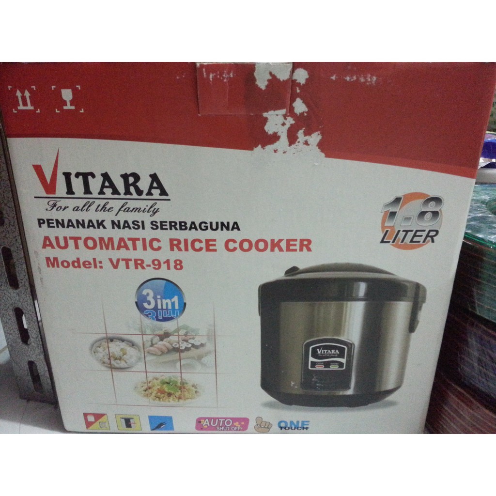 Fitur produk Magic Com / Rice Cooker Stainless Vitara 1.8 Liter Murah VTR-918 : 1. Kapasitas 1.8 Liter 2. 3-in-1 : Memasak , memananskan , mengukus 3. Bagian dalam dilapisi anti gores 4. Otomatis menjaga tetap panas 5. Perlindungan otomatis pada suhu tinggi 6. Aksesoris : mmangkuk ukur , sendok nasi , panci kukus