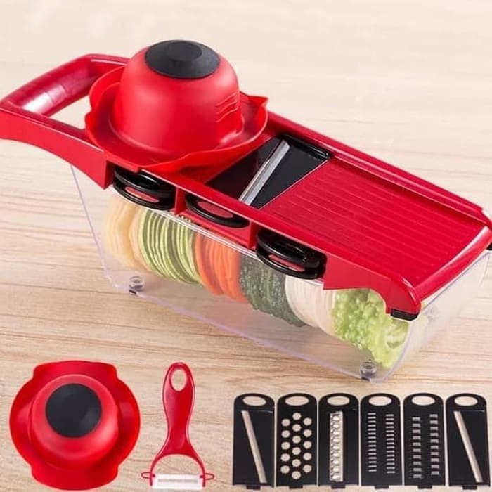*Isi Kemasan: 1x pengiris mandolin 5 x pisau (shredder tipis, shredder tebal, alat pengiris datar, alat pengiris bergelombang, parutan parutan) 1 x pengupas (acak warna) 1x rak penyimpanan yang aman 1 x mengiris pelindung serbimurah