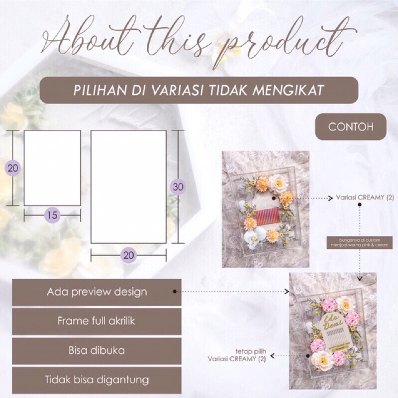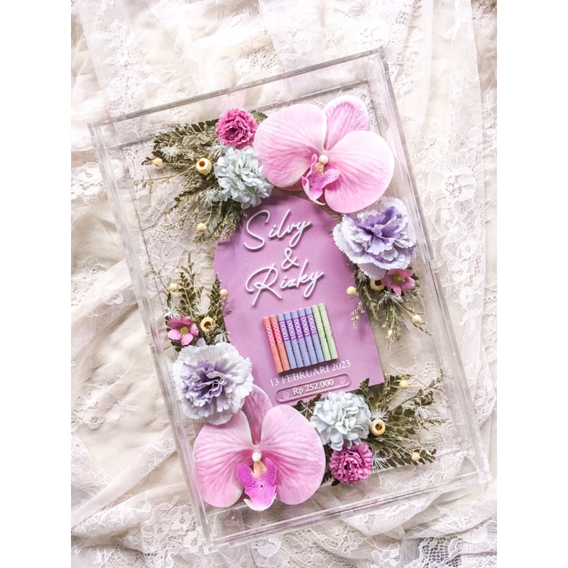 SUDAH TERMASUK : • Nama, tgl & nominal (bisa pilih mau PRINT / TIMBUL) • Material Plat Background : Kertas Jasmine • Frame 25x35 full akrilik • Artificial Flowers • Dried Flowers import • Free uang mainan max 15pcs
