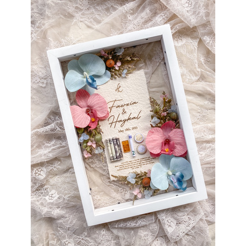 DESKRIPSI PRODUK : • Frame 20x30 Double akrilik (untuk ukuran lebih besar, bisa chat yaaa) • Handmade paper • Artificial Orchid Premium • Simple Dried Flowers • Free uang mainan max 15pcs • Free packing bubble tebal & kardus