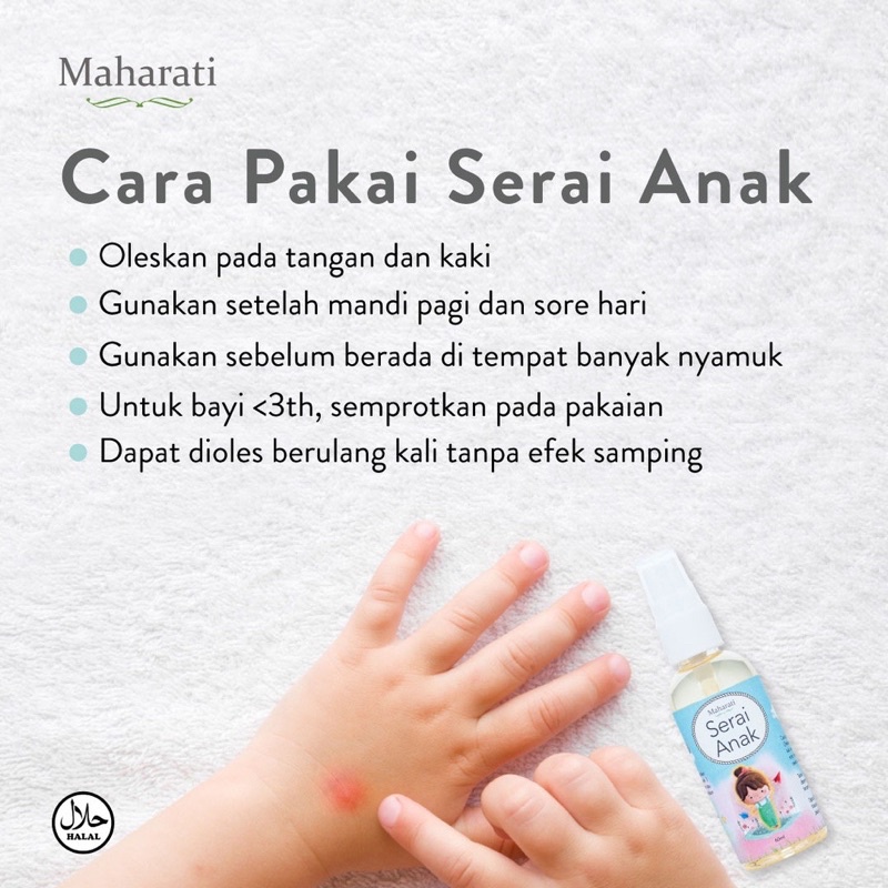 Serai Anak Maharati adalah produk ramah lingkungan yang terbuat dari 100% bahan alami, ampuh melindungi anak dari gigitan nyamuk, baik ketika tidur maupun ketika beraktivitas seharian di dalam dan luar rumah. Serai Anak Maharati juga dapat meredakan gatal-gatal dan memudarkan bekas gigitan serangga.