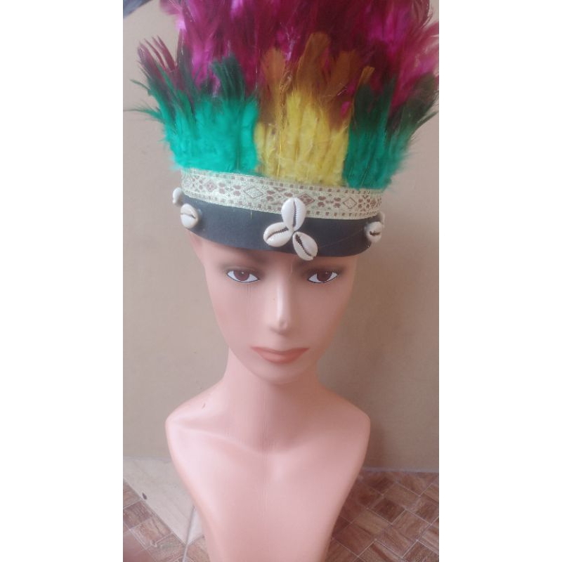 hiasan kepala papua berbahan bulu,kerang,renda yg dikombinasi warna2 yg menarik,bisa dipakai dewasa,anak anak,laki2 dan perempuan