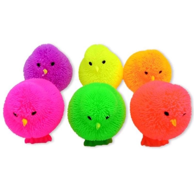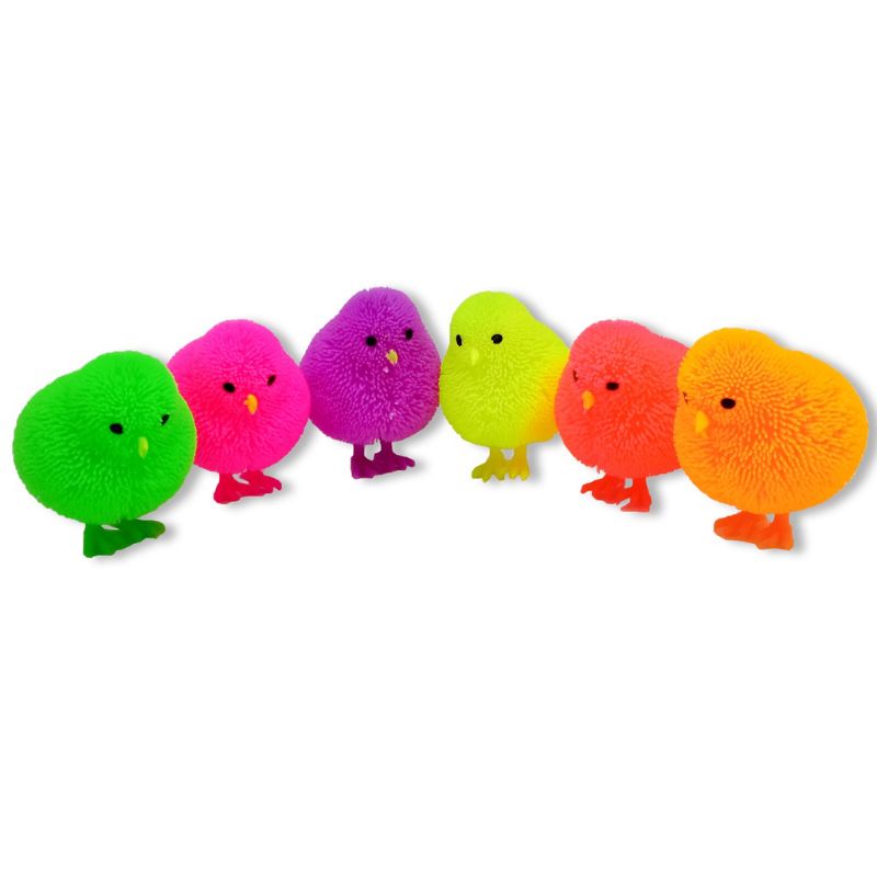 Anak Ayam, mainan pencet anak dan bayi berbahan karet yang bila diguncang / dipukul akan nyala lampu kelap-kelip. Terdapat bulu-bulu halus dari karet. Dapat melatih indra peraba dan penglihatan anak.