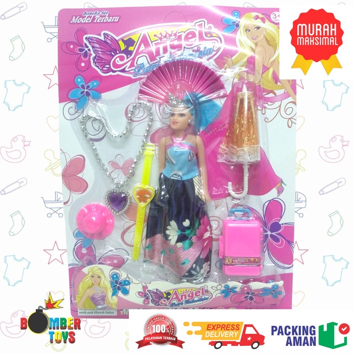 1 Paket boneka berbiee terdiri dari : 1 boneka berbiee perempuan dengan gaun anggun, dan dilengkapi aksesoris (tas koper, payung, jam tangan, topi, kalung, kipas).