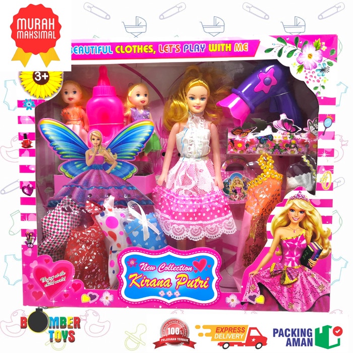 1 Paket boneka berbiee terdiri dari : 1 boneka berbiee perempuan dengan gaun anggun, 2 boneka berbie anak dan dilengkapi aksesoris (botol susu, tas, hairdryer dan 6pcs baju ganti perempuan dengan model &motif berbeda). Non Ori