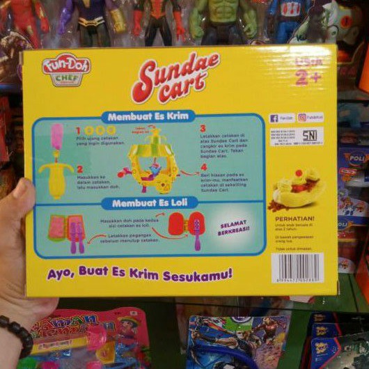 Detail & Spesifikasi : - Sundae Cart - 2pcs Gelas es Krim - Cetakan es krim - 3pcs Mata cetakan es krim - 3 warna Doh/Lilin - Tangkai Es Loli - Cetakan Es Loli - Roller - 2pcs Pencungkil es krim