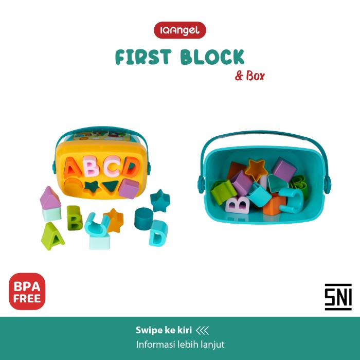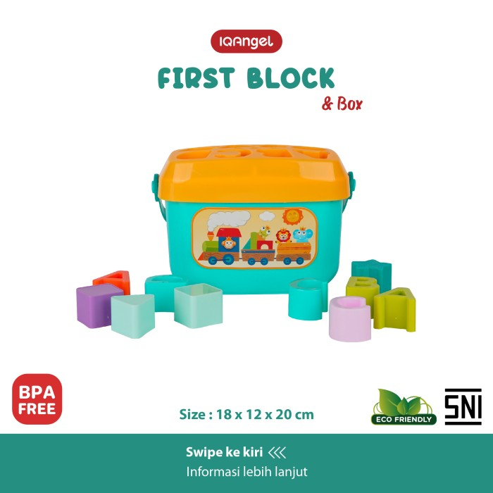 IQ ANGEL First Block & Box - IQ0218 Kotak blok penyortiran memiliki huruf dan pola di bagian atas kotak, yang dapat dimasukkan sesuai dengan bentuk balok. Kotak tersebut dapat digunakan sebagai kotak penyimpanan. Dan sudah diuji sesuai dengan standar internasional. Cocok untuk usia anak mulai dari 18+ bulan. "Tingkatkan kemampuan sensorik dan motorik si kecil" Material : - PP Penghargaan IQ ANGEL : - TOP AWARENESS SALES & RATING 2021 - BRAND CHOICE Mom & Kids 2022 - INDONESIA BRAND CHAMPIONS 2022 Manfaat : - Taktil atau melatih indera peraba si kecil terhadap sentuhan - Penglihatan melatih indera penglihatan si kecil dalam mengenal bentuk dan warna Keunggulan : - SNI - BPA FREE - ECO Friendly - Permukaan halus - Mudah dibawa kemana - mana