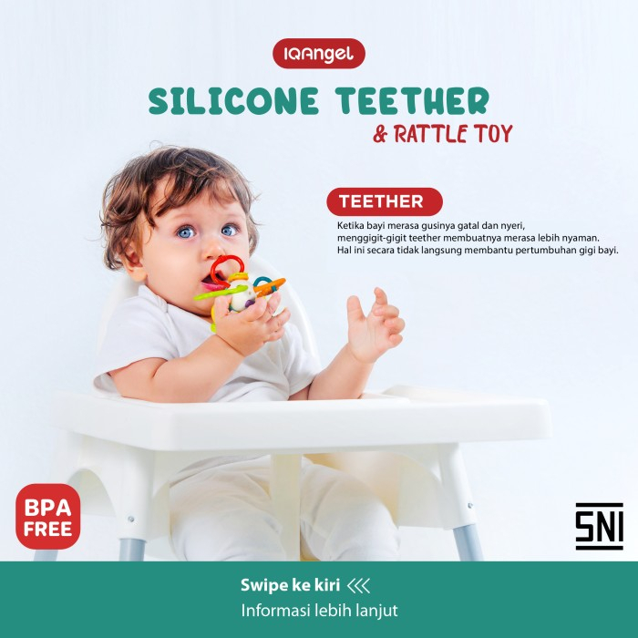 IQ ANGEL Silicone Teether & Rattle - IQ0190 Gigitan bayi dengan banyak varian yang menarik perhatian bayi. Aman untuk memijat dan mengurangi rasa tidak nyaman pada gusi saat masa pertumbuhan gigi. Dan sudah teruji standar internasional. Cocok mulai dari 0+ bulan. "Tingkatkan kemampuan motorik dan sensorik si kecil" Material : - PC - ABS - TPU Penghargaan IQ ANGEL : - TOP AWARENESS SALES & RATING 2021 - BRAND CHOICE Mom & Kids 2022 - INDONESIA BRAND CHAMPIONS 2022 Manfaat : - Taktil atau melatih indera peraba si kecil terhadap sentuhan - Penglihatan melatih indera penglihatan si kecil dalam mengenal bentuk dan warna - Stimulasi pendengaran si kecil terhadap suara - Pertumbuhan gigi menjadi lebih baik Keunggulan : - SNI - BPA FREE - ECO friendly - Permukaan halus - Menghasilkan suara - Dapat direbus / steril up hingga suhu 120 derajat - Gigitan bayi dengan bahan yang aman dan terbaik