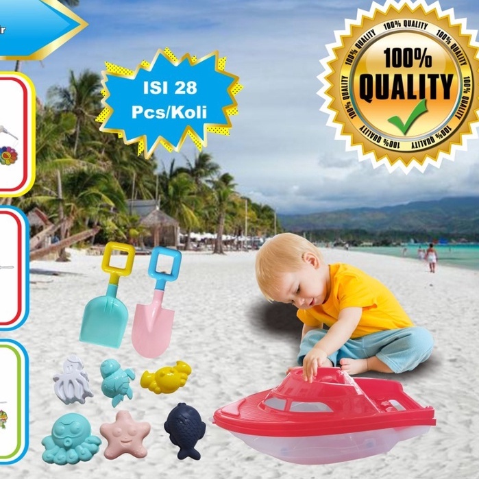 ainan pantai set yang berisi macam-macam peralatan untuk bermain pasir pantai diantaranya : beberapa cetakan dan alat bermain pasir lainnya. kapal + alat mainan 8 macam