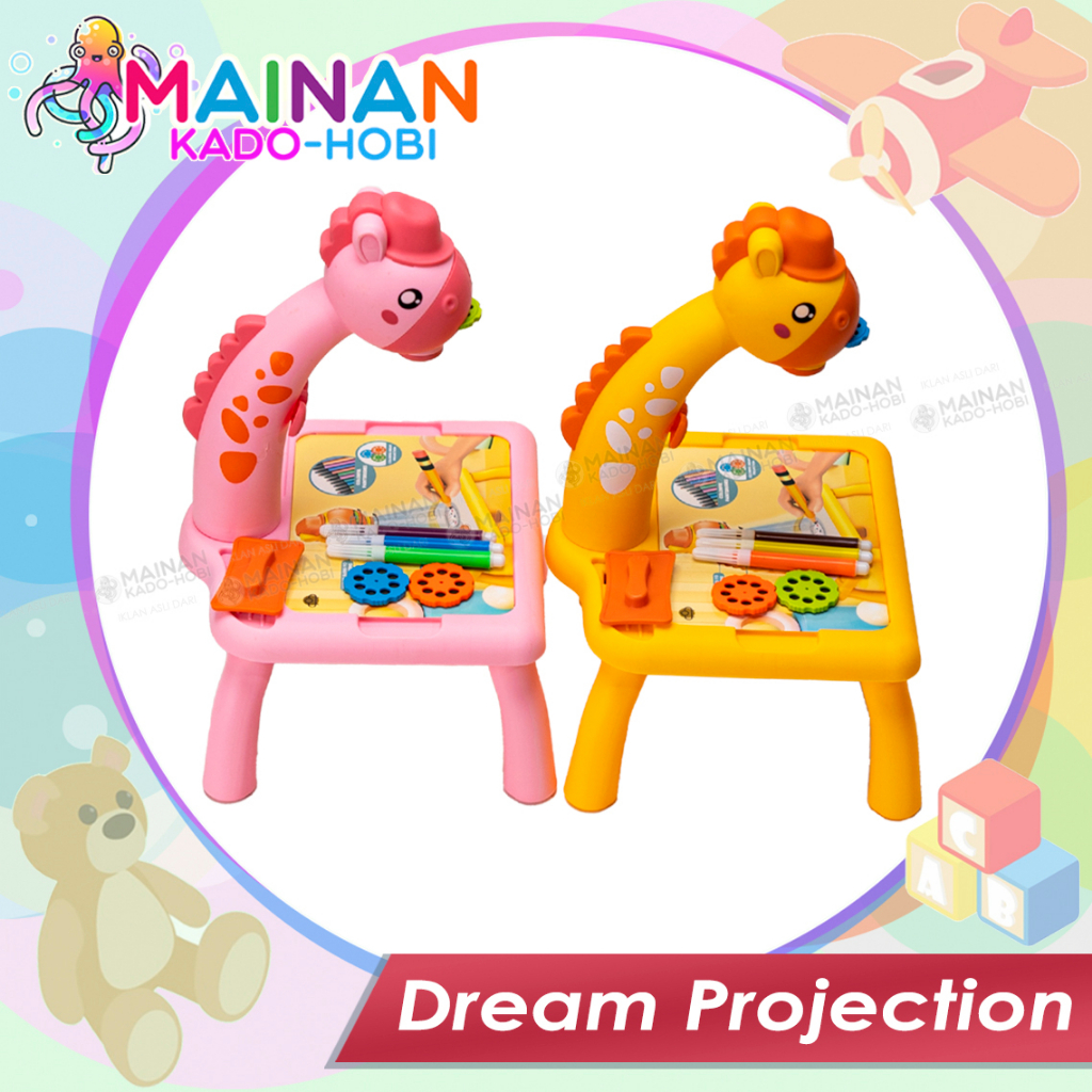 Isi Kemasan : -1 SET - Mainan Edukasi Dream Projection (BELUM TERMASUK BATERAI) TERDIRI DARI : - Meja Projektor - Proyektor - Keping Film - Set Spidol Warna - Penghapus - Art Book