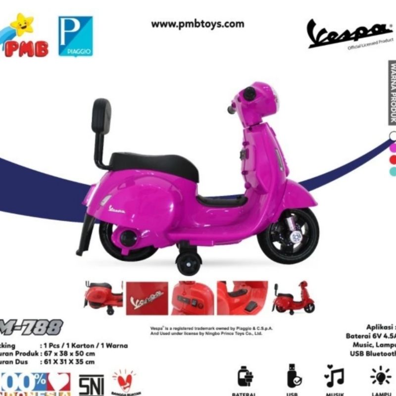 Detail Produk : Merk : PMB Type : M 788 Model : Vespa lisensi resmi rangka :Besi kokoh body : Plastik tebal Aki : Aki kering 1 x 6v4.5ah Akselerasi : Injak pedal kaki Tombol penggerak : maju,netral,mundur Charger : 6 volt kursi : 1 kursi Musik : Ada mp3 slot Usb : Ada bluetooth : ada Klakson : Ada Lampu : Ada depan dan belakang Ban : Plastik usia : 2 - 4 tahun Gender : Unisex Maksimal Beban : 25 kg Warna : Sesuai di display iklan Ukuran dus : 60 cm x 32 cm x 35 cm Ukuran produk : 62 cm x 35 cm x 47 cm Tinggi jok : 30 cm Buatan : Indonesia Sertifikasi : produk SNI