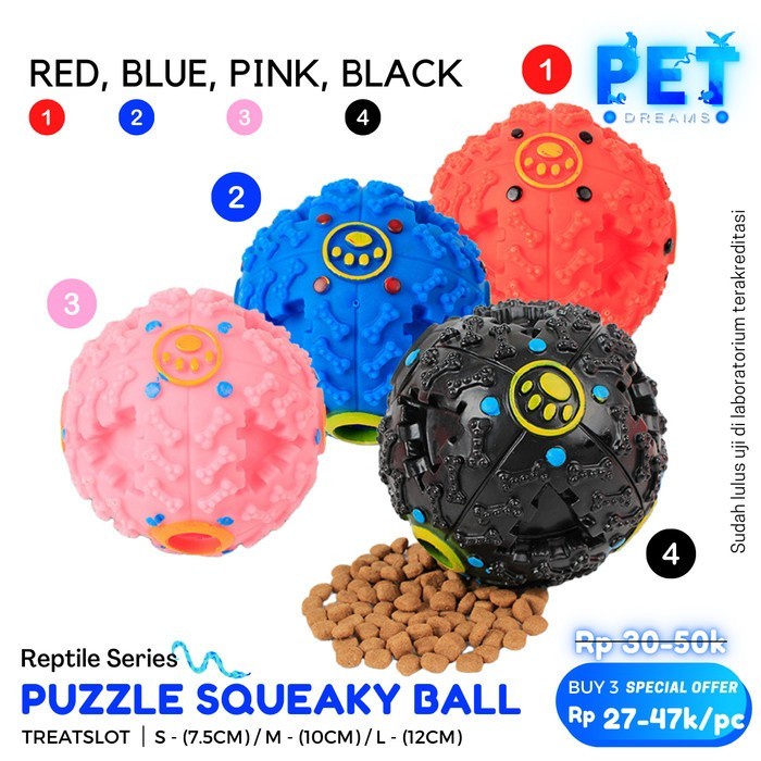 Spesifikasi BOLA ANJING SQUEAKY : Warna: Merah, Biru, Hitam, Pink (Random) Bahan: Eco-Friendly/Non-TOXIC Rubber Filling: Dog Treats - Food Puzzle