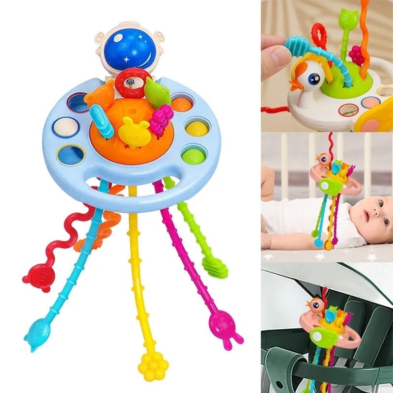 Mainan sensorik berbentuk bebek/astronot kartun lucu, bayi dapat menjelajahinya melalui suara dan getaran yang berbeda seperti pull-up, pull-down, pressing, shaking.
