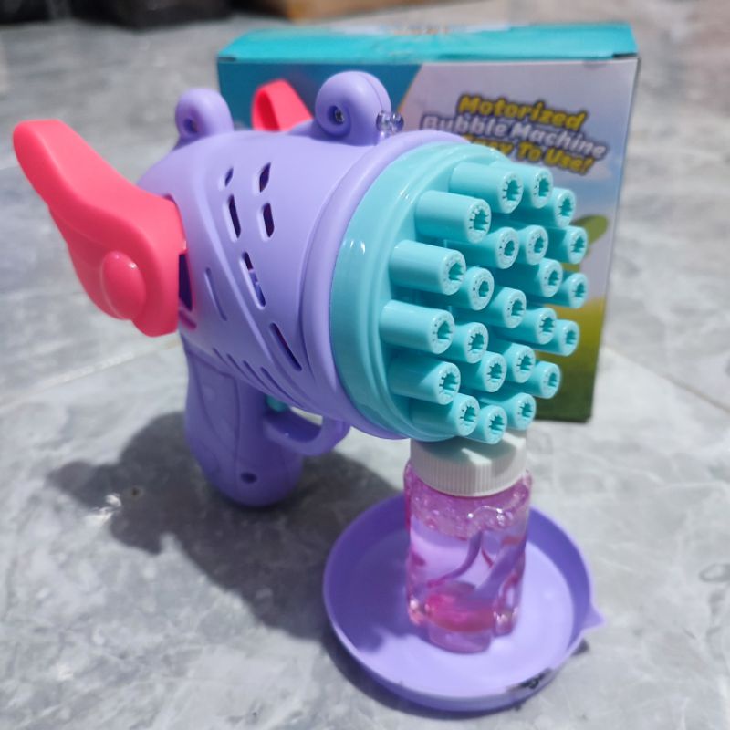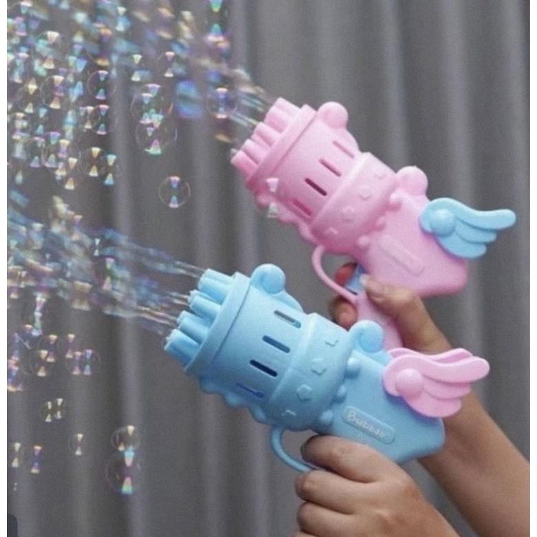 Mainan pistol pistolan ini membutuhkan 3 buah baterai ukuran AA 1,5v. Mohon maaf baterai tidak termasuk dalam produk. Tersedia dalam 2 warna pink dan biru. Mainan ini seperti bubble camera, yaitu mainan ini menghasilkan gelembung gelembung sabun. Disediakan sebotol kecil berisi air sabun untuk memainkannya. Wadah untuk menampung air sabun juga tersedia. Mainan ini sudah SNI dan terbuat dari plastik. ------------------------------------------ Spesifikasi Kemasan : Panjang : 17 cm Lebar : 8 cm Tinggi : 15 cm Berat : 340 gram