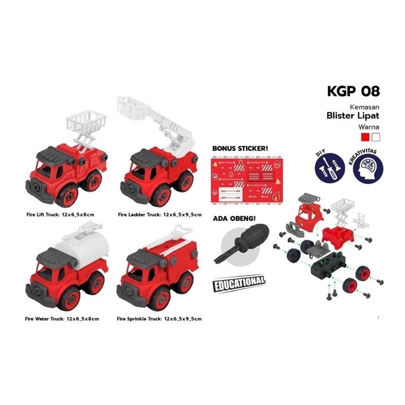 Mainan DIY Bongkar Pasang Mobil 1. Kuning Mobil Konstruksi (isi 4) 2. Merah Mobil Pemadam Kebakaran (isi 4) 3. Hijau Mobil Kebersihan (isi 4) 4. Truck Panjang Trailer Hijau/Kuning (isi 1) 5. Campur Warna (isi 4)