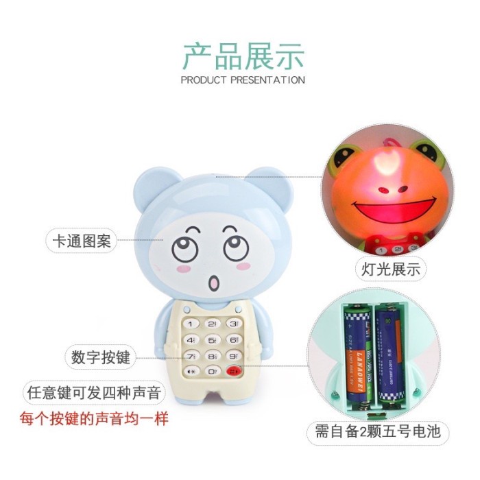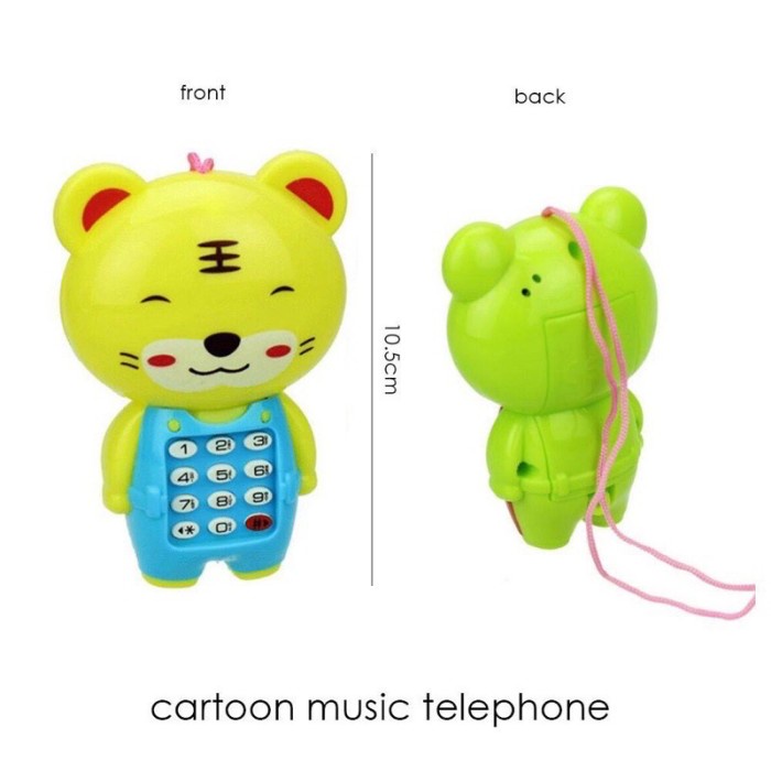 Bahan: Plastik Jenis kelamin: Unisex Daya: Gunakan 2 baterai (tdk termasuk didalam paket) Fitur produk: dengan musik, cahaya, efek suara telepon Kisaran Usia: 0-5 Tahun Warna: Random Fungsi: Pendidikan Dini Ukuran Produk: 10.5 * 7 * 3.5cm