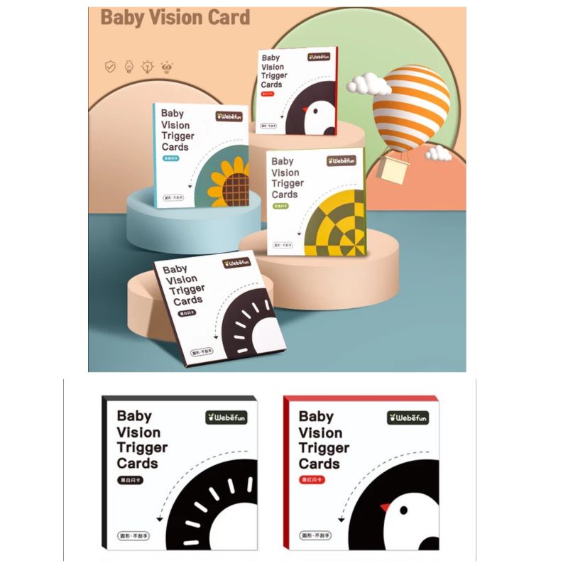 The double-sided and oversized cards are made of thick cardboard and present contrasting illustrations based on the baby's vision.