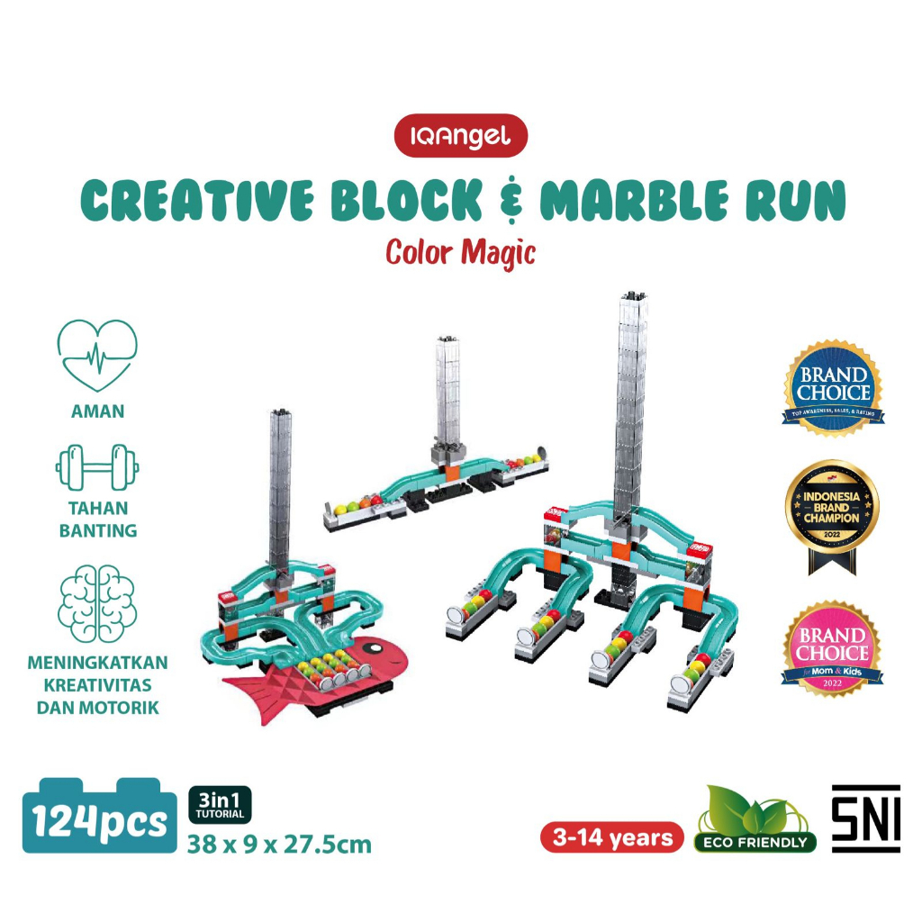Creative Block & Marble Run Toys Color Magic yaitu Inovasi baru mainan edukatif berbentuk 3D Puzzle dengan total items 124 pcs yang bisa dirakit menjadi 4 bentuk yang berbeda sehingga dapat melatih willpower, kemampuan belajar, observasi, imajinasi, konsentrasi, serta mengembangkan operasional konkret dan kognitif anak. Selain itu mainan ini dapat mempererat ikatan orangtua dan anak saat memainkannya bersama. Cocok untuk anak usia 3-14 tahun.