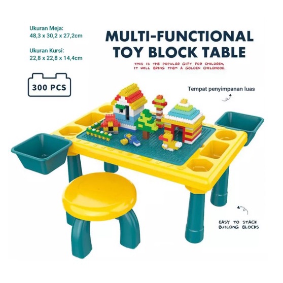 Termasuk 58 pcs block bricks ukuran SEDANG Ukuran Meja:48,3 x 30,2 x 27,2cm Ukuran Kursi: 22,8 x 22,8 x 14,4cm