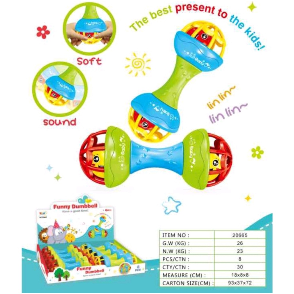 Mainan kerincingan berbentuk barbel lentur dengan bahan silikon yang aman untuk bayi , sehingga bayi dapat menggunakannya dengan aman . Sangat bermanfaat untuk melatih kemampuan visual bayi dan perkembangan indera pendengaran, dan dapat melatih si kecil untuk menggenggam benda. Warna cerah dan bunyi gemerincing yang gampang menarik perhatian bayi.