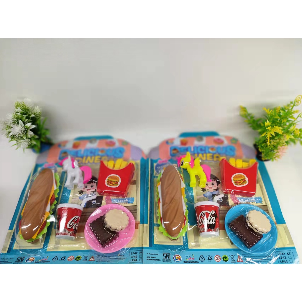 MAINAN MASAK MASAKAN FAST FOOD DELICIOUS DINNER KUDA PONY - LF 42 Mainan ini adalah mainan masak masakan anak dalam bermain peran Fast Food . Dikemas dalam plastik mika, Bahan mainan pun berkualitas , aman untuk dimainkan karena sudah SNI . Sangat cocok untuk dijadikan koleksi mainan sikecil 1set terdiri dari Kuda Pony , Hotdog yang bisa dibongkar pasang/disusun , french fries . kue , ice cream , minuman soda dll seperti yang ada digambar. uk kemasan 26 x 6 x 26 cm