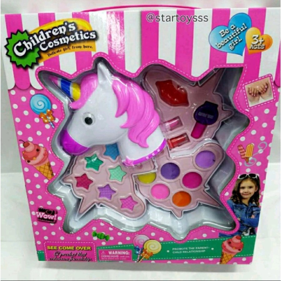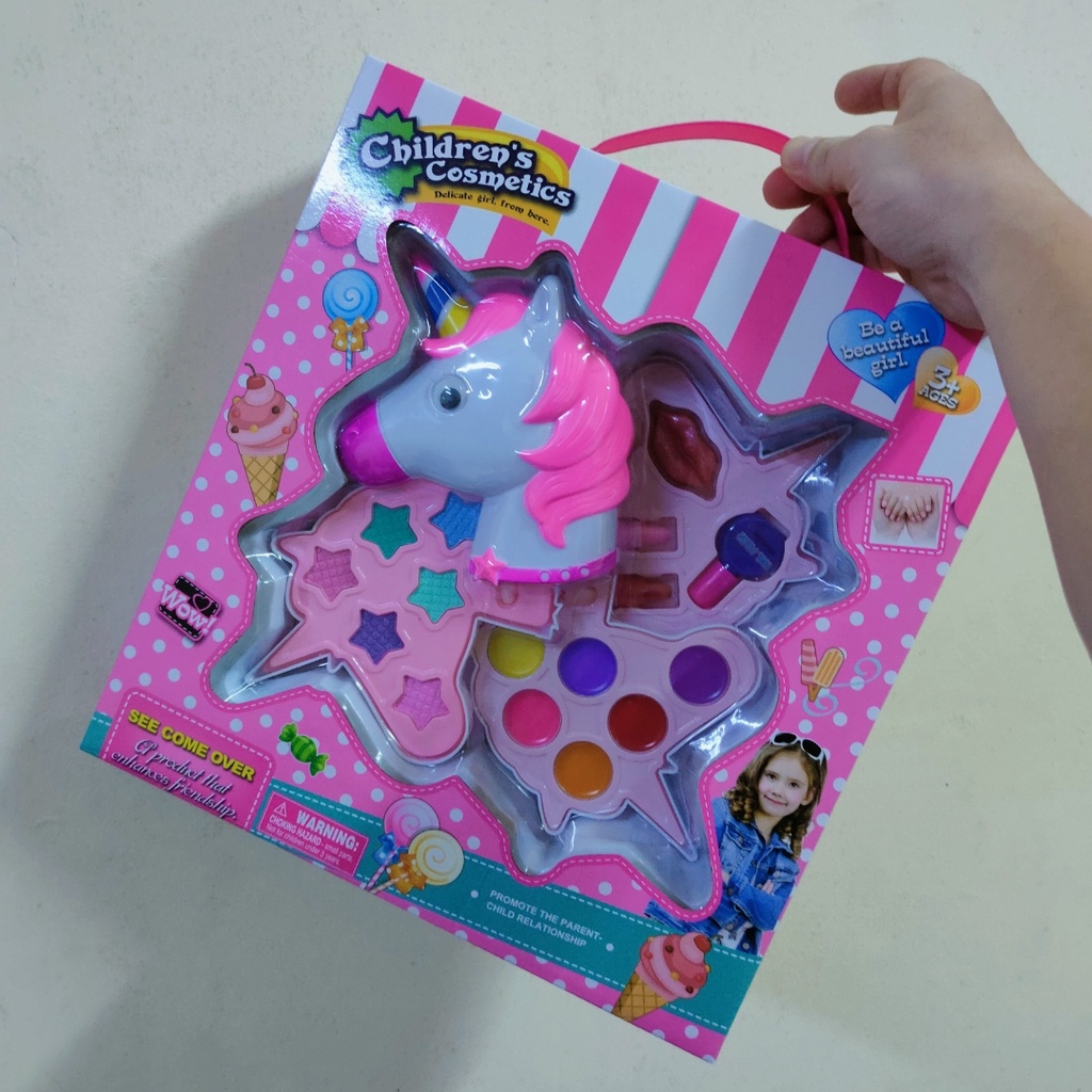 Hadir mainan edukatif make up anak perempuan, dengan desain kuda pony yang lucu dan menarik Salah satu mainan favorit bagi anak perempuan dan sangat cocok dijadikan kado sikecil. terdiri dari ; - LIPSTIK - Lipgloss , - Kutek , - Eyeshadow, dll seperti digambar ya. Ukuran kemasan 31.5cm x 29cm x 6.5cm