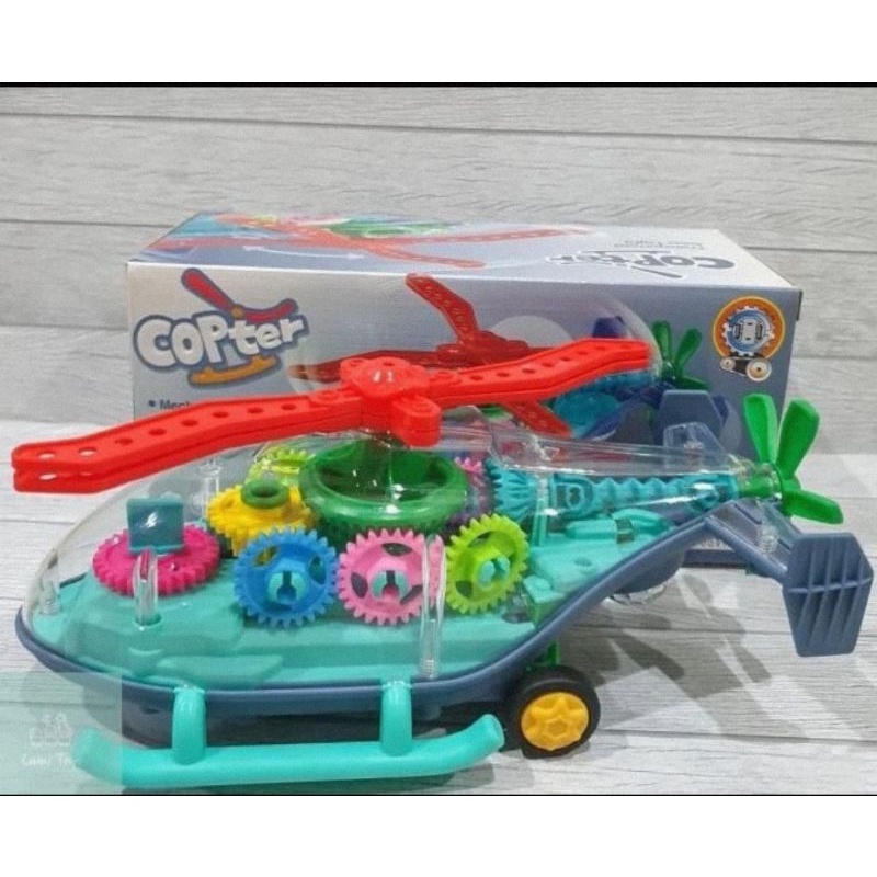 Mobil mobilan transparan yang berisi gear. Gear dapat berjalan ketika mobil berjalan. Mobil di lengkapi lampu dan musik, menambah seru ketika bermain.