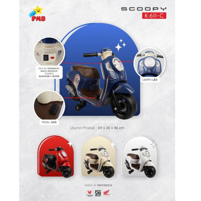 Mainan Motor Aki Anak PMB K611C Honda Scoopy Official Licensed byHonda SPESIFIKASI PRODUK : Merk : PMB Kode Produk : K611C OFFICIAL LICENSED PRODUCT DETAIL PRODUK : - Material : Plastik & Besi - Baterai 6V 4,5ah - 1 Dinamo - Pedal Gas manual injak kaki - Tidak pakai remote - Roda 4 - Ban pelastik tengahnya karet - Musik - Klakson - Lampu LED - Akselerasi anti kejut - Transmisi : Maju & Mundur - Transmisi : Belok kanan - Include charge aki TERSEDIA 4 WARNA: -Merah -Biru -Putih -Kream DIMENSI : • Produk : 69 x 36 x 46 cm • Dus : 58 x 26 x 36 cm 1 Dus isi 1pcs, 1 Warna Disarankan untuk anak umur 3-5 tahun, dengan berat maksimal 25 kg
