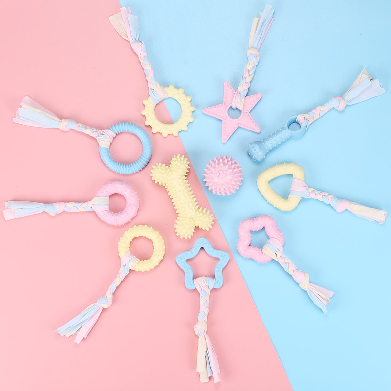 Ukuran:Kurang Lebih 18cm Warna: Dikirim Random(kuning, merah muda, biru) Fitur:Ada partikel yang menonjol di permukaan mainan, yang dapat membantu anjing membersihkan giginya tanpa melukai giginya. Warna macaronsnya bagus, dan talinya bagus dan kokoh, dan tidak mudah putus , membuat anjing lebih senang dan bahagia.