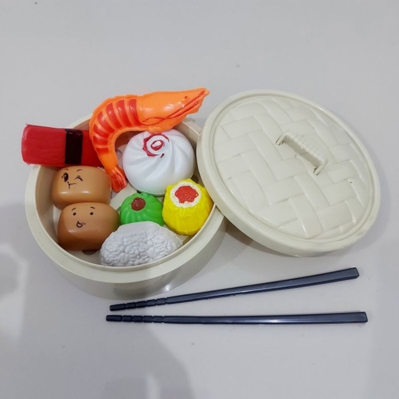 Mainan dimsum 1 set terdapat berbagai macam makan an dimsum berserta sumpit nya didalam tempat yang lucu yang ada penutup nya