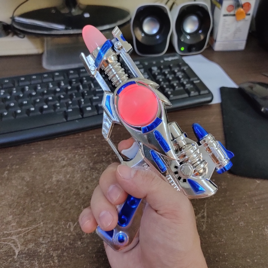 Mainan Pistol elektrik yang didesain kecil pas digenggaman tangan anak, memakai baterai 2 pcs , mengeluarkan bunyi dan lampu.