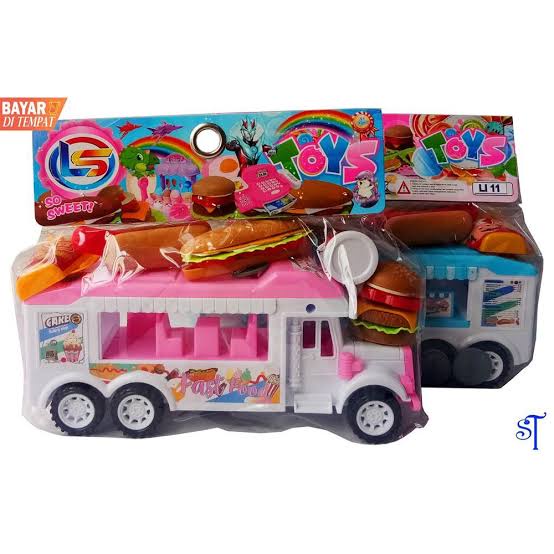 Deskripsi : - Mainan mobil truk fast food yang berisi hamburger, sandwich, hotdog, minuman, kentang goreng, ayam, dan uang logam mainan - Untuk hamburger, sandwich, dan hotdog dapat dibongkar pasang - Bagian kanopi truk dapat ditarik/dimasukkan - Terbuat dari bahan plastik kualitas SNI
