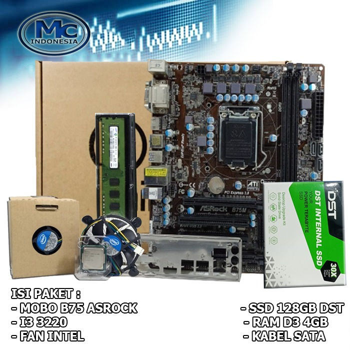 SPESIFIKASI : - MOBO B75 ASROCK LGA 1155 - PROCESSOR I3 3220 - FAN INTEL ORI - RAM PC DDR3 4GB PC3L (MERK YANG DIKIRIM RANDOM SESUAI STOCK) - SSD 128GB DST