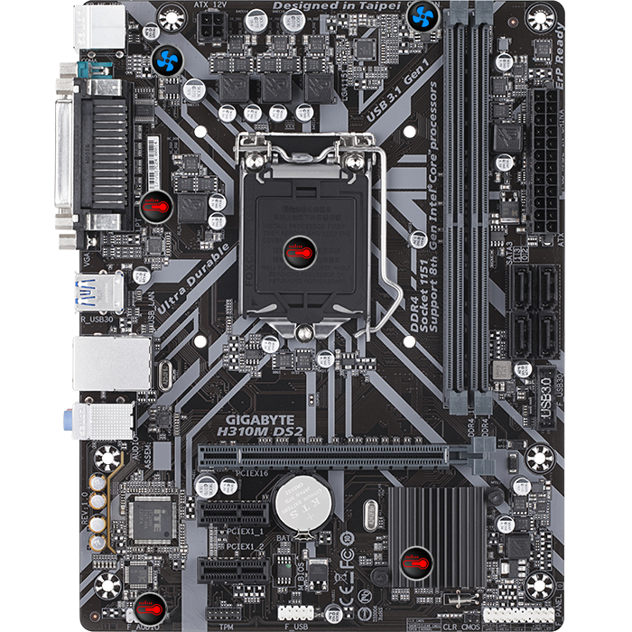 Mainboard Motherboard Mobo LGA 1151 H110M DDR4 Merk Gigabyte Seri GA-H310M-DS2 Support Processor G, Core i3, Core i5, Core i7 Generasi ke 8 dan 9 Support Maksimal RAM 32GB DDR4 2666/2400/2133 MHz Onboard Video Chipset : Integrated Graphics Processor Audio Chipset : Realtek ALC887 LAN Chipset : Realtek GbE LAN chip (10/100/1000 Mbit) Rear Panel Ports : 1 x PS/2 Mouse/Keyboard port, 1 x parallel port, 1 x serial port, 1 x D-Sub port, 2 x USB 3.1 gen 1 ports, 4 x USB 2.0/1.1 ports, 1 x RJ-45 port, 3 x audio jacks (Line In, Line Out, Mic In) Form Factor : Micro ATX (22.6cm x 17.4cm)