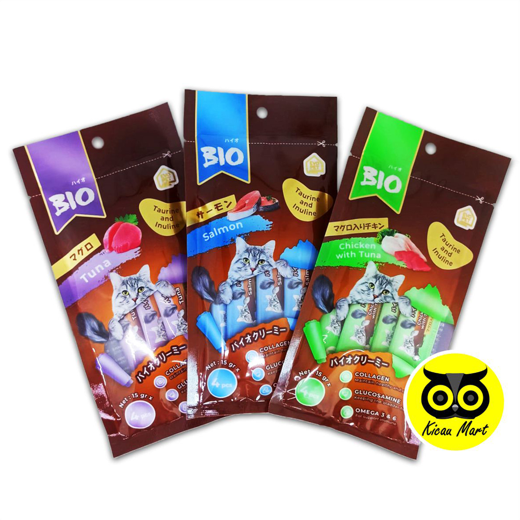 Bio Creamy snack cair kucing (snack liquid) digunakan sebagai vitamin untuk menambah nafsu makan kucing. Wangi varian Chicken & Scallops akan menarik perhatian kucing. Dilengkapi dengan Taurine untuk menjaga kesehatan kucing terutama bagian otak, saraf, mata, jantung, pencernaan, imun dan reproduksi. Bio Creamy juga di lengkapi dengan collagen, glucosamine, omega 3 dan omega 6.