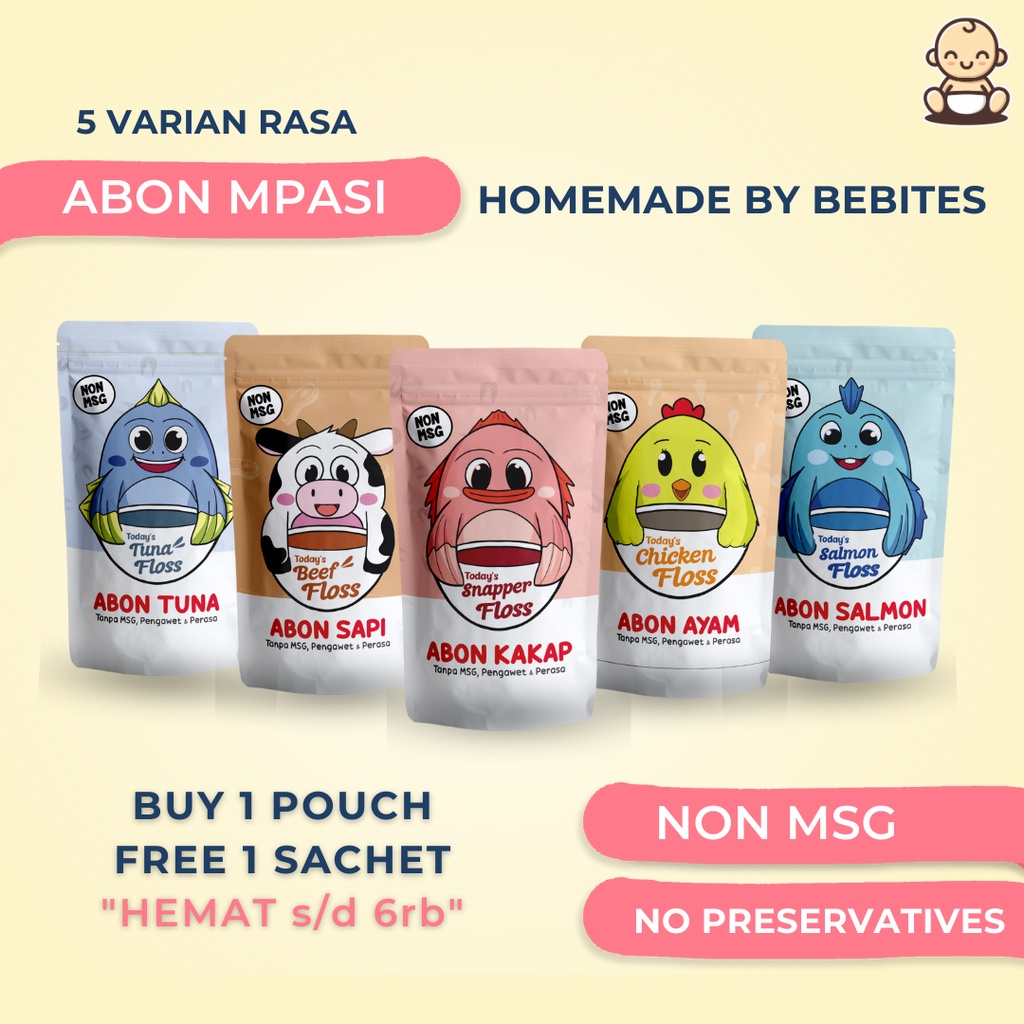 Makanan Mpasi Abon Bayi Penambah Berat Badan Nafsu Makan Non MSG Organik Homemade Bebites PUAB-003 - KEMASAN BARU..!! Sudah mendapat izin edar Dinkes P-IRT, next step ke BPOM dan Halal MUI, doain lancar ya ^_^ Abon Bebites dibuat Pure dari setiap varian TANPA CAMPURAN APAPUN. Diolah secara higienis, tanpa bahan pengawet dan MSG, sehingga aman bagi anak. Kelezatan berbagai macam variant abon disukai anak-anak maupun dewasa.. - Varian Besar : Ayam Sapi, Salmon, Tuna, Bandeng, Patin, Kembung, Kakap Sachet 4gr : Ayam Sapi, Salmon, Tuna, Bandeng, Patin, Kembung, Kakap - Makanan Mpasi Abon Bayi Penambah Berat Badan Nafsu Makan Non MSG Organik Homemade Bebites PUAB-003 - Komposisi : Bahan sesuai varian, Rempah-Rempah, Gula & Garam - Bisa dikonsumsi anak usia 1 tahun ke atas. Cara mengkonsumsinya bisa langsung dimakan, atau bisa ditaburkan di atas nasi/bubur si kecil - Expired Date 9 bulan, kami selalu kirim produksi terbaru. - Makanan Mpasi Abon Bayi Penambah Berat Badan Nafsu Makan Non MSG Organik Homemade Bebites PUAB-003