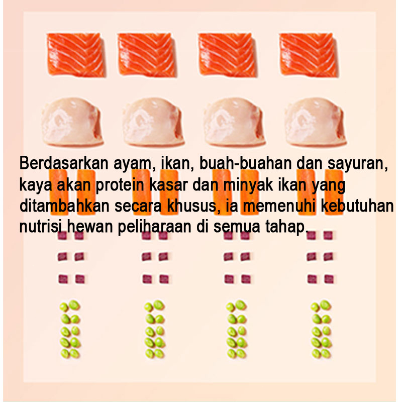 Berdasarkan ayam, ikan, buah-buahan dan sayuran, kaya akan protein kasar dan minyak ikan yang ditambahkan secara khusus, ia memenuhi kebutuhan nutrisi hewan peliharaan di semua tahap.