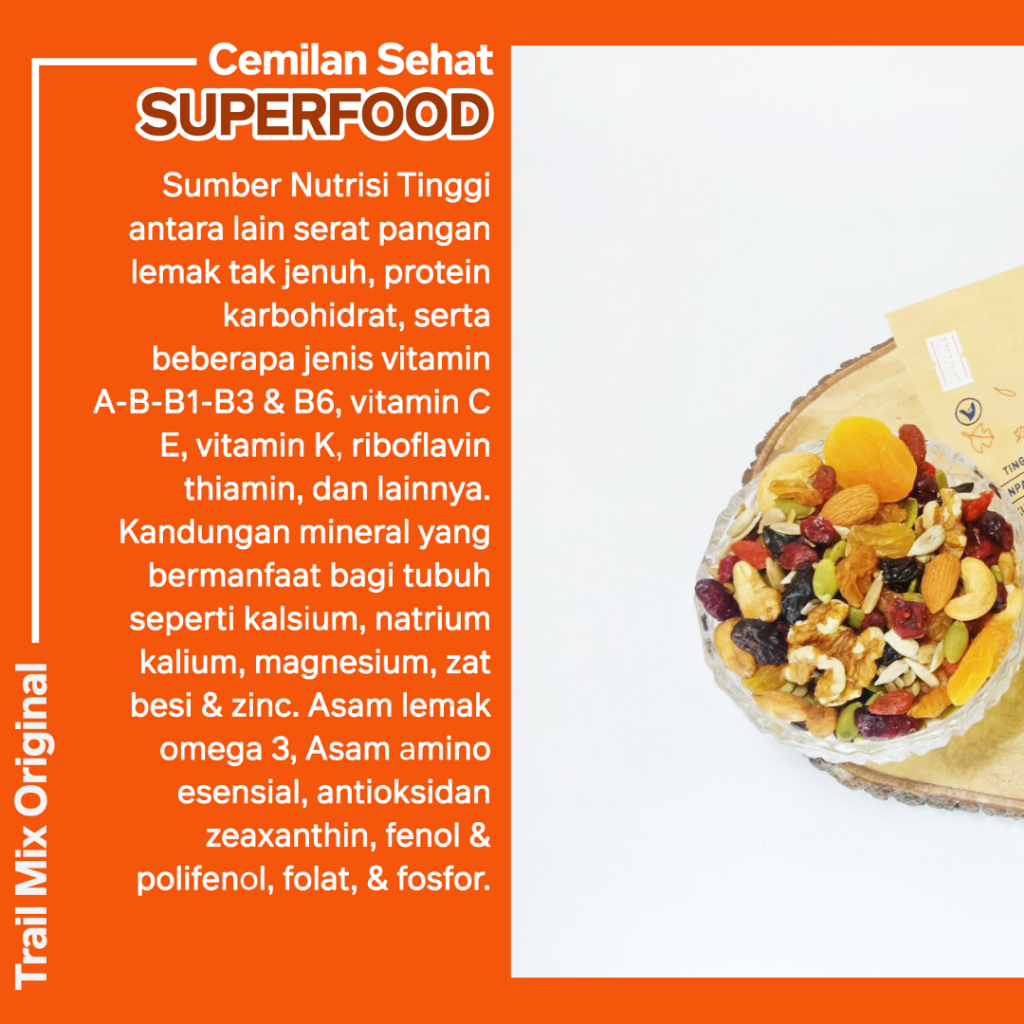 Trail Mix Original 100g => Komposisi : 1. Roasted Almond 10% 2. Walnut 5% 3. Roasted Cashew 10% 4. Dried Goji Berry 5% 5. Golden Raisin Super 13% 6. Dark Raisin Super 12% 7. Dried Apricot 10% 8. Dried Cranberry 10% 9. Pumpkin Seed 10% 10. Sunflower Seed 15%