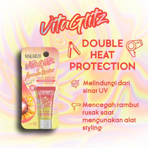 Makarizo Vitaglitz Hair Strength Booster untuk memperkuat struktur batang rambut agar tidak rapuh dan kusam, serta membuat rambut terlihat berkilau. Dengan kandungan Double Heat Protection Formula untuk melindungi rambut dari panas matahari dan alat penata rambut seperti hair dryer, catokan, dan pengeriting.