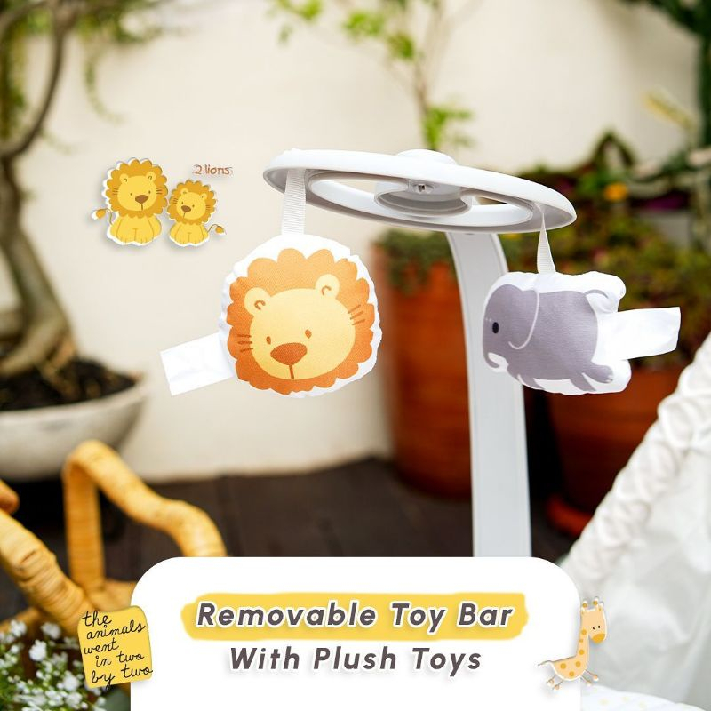 Untuk menjaga anak Anda tetap senang dan terhibur, Futton menampilkan bar mainan yang dapat dilepas dengan mainan isi overhead, kotak musik.