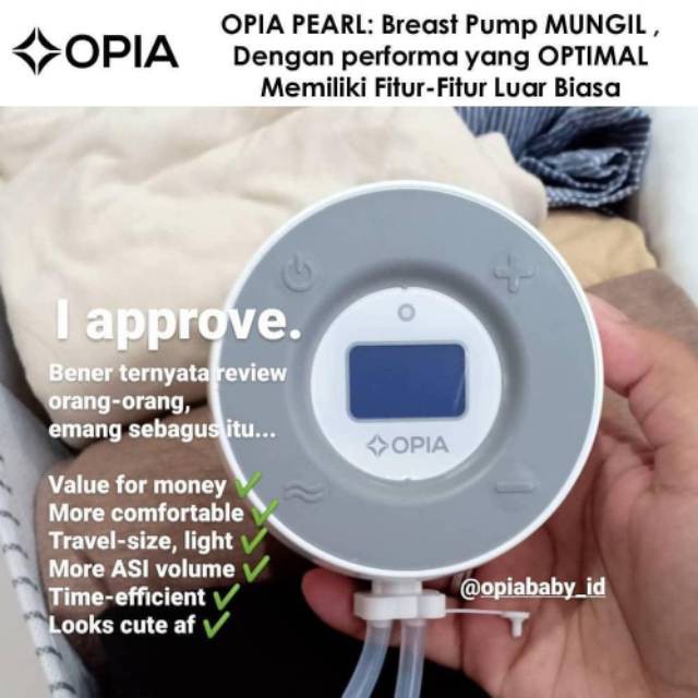 Opia Breast pump sendiri mempunyai fitur keunikan yang tidak di punyai oleh Breast pump lain pada umumnya: - Medical Grade Breast Pump - Light Weight & Travel Size Mudah dibawa ke manapun dan dimanapun, unit mesin yang sangat ringan - Easy to Use Sangat mudah digunakan dan bisa langsung Massage/ Expression tanpa setting complex untuk langsung mulai memompa ASI - Closed System Artinya ASI perah tidak akan masuk ke dalam mesin sehingga mesin akan relatif Lebih Awet & Lebih Higienis - Rechargeable Battery with USB micro Portable sehingga bisa pumping on the go - dimana saja. Bisa bertahan saat tidak ada listrik, jadi cukup di charge saja - Memiliki 2 fase dalam memompa, yaitu Fase Stimulasi /Massage & Fase Expression /Memerah. Dengan keduaFfase ini diharapkan hasil pompa Lebih Optimal - Pengaturan hisapan pompa. Dapat diatur pompa hisapannya dari Lembut sampai Kuat - Unique Rhythm dan Pumping Technology Membuat Opia Pearl kecil tetapi efektif memompa ASI karena metode dan technology pumping yang unik sesuai level yang digunakan - Double Pump System Sehingga dapat menghemat waktu memompa PD Kanan & Kiri bersamaan - BPA Free