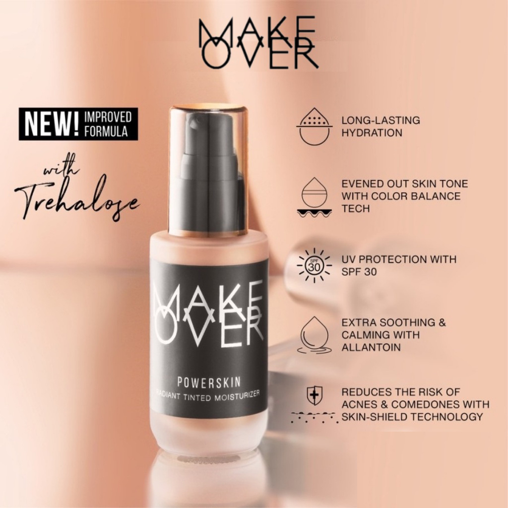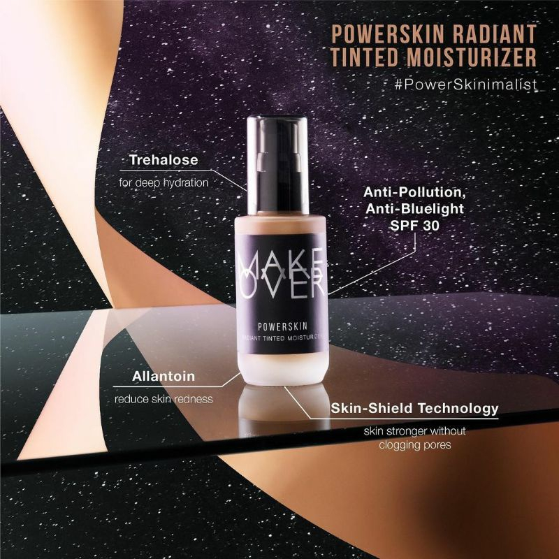 MAKE OVER Powerskin Radiant Tinted Moisturizer is a tinted moisturizer with Color Balance Technology Benefit : 1. Provides Long Lasting Hydration Memberikan hidrasi dengan kandungan ingredient Trehalose 2. Even Out Skin Tone Dengan Color Balance Technology, memberikan coverage yang sheer-natural 3. Flawless Radiant Dewy Finish 4. Powered with Skin-Shield Technology Dengan menggunakan Skin-Shield Technology, mengurangi resiko muncul jerawat dan komedo yang disebabkan oleh pori-pori kulit tersumbat, serta memperkuat skin barrier. 5. Equipped with Anti-Pollution & Anti Bluelight Actives Melindungi kulit wajah dari partikel radikal bebas dari polutan dan sinar bluelight 6. Comes with 4 Universal Shades