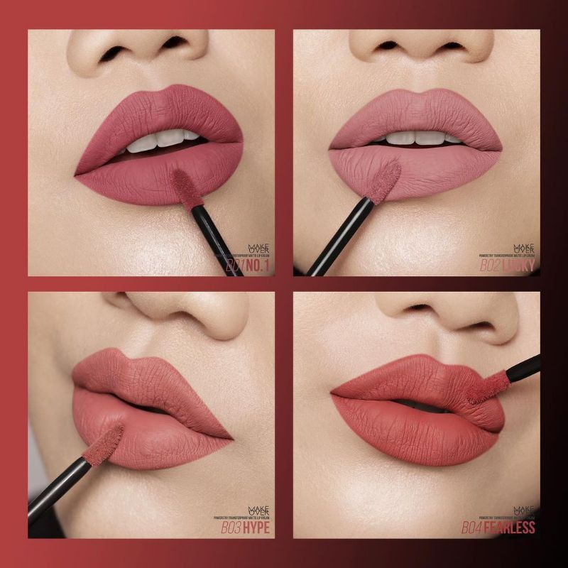 Make Over Powerstay Transferproof Matte Lip Cream. Lipstik Matte yang formulanya thick cream yang langsung ngeset jadi transferproof matte dalam hitungan beberapa detik. Produk ini mudah diratakan dan juga terasa ringan dibibir.