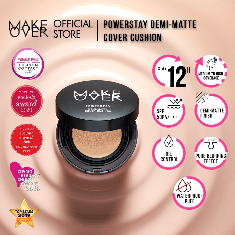 Make Over Powerstay Demi-Matte Cover Cushion diformulasikan dengan kemampuan oil control yang telah melalui uji terbaru dan terbukti dapat memberikan ketahanan tampilan flawlessyang tidak cakeyhingga 24 jam*, sehingga sangat cocok untuk kulit berminyak. Cushion ini merupakan cushion compact dengan coverage medium-to-full, memberikan hasil demi-matte dan soft-focus yang terlihat seperti kulit sehat yang halus. Mengandung SPF 50/PA++++ yang memberikan proteksi ekstra ke kulit dari paparan berlebih sinar matahari. Dilengkapi dengan aplikator puff anti-bakterial yang tahan air, sehingga tidak menyerap produk dan memberikan coverage yang maksimal. Dermatologically Tested, Non-Comedogenic, Alcohol-free dan Hypoallergenic.Kini tersedia dalam 20 shades yang beragam, dipilih bedasarkan riset warna & undertone kulit ke lebih dari 1000 wanita multi-etnis Indonesia dari Sumatra hingga Papua, menggunakan Shade Matching Technology.